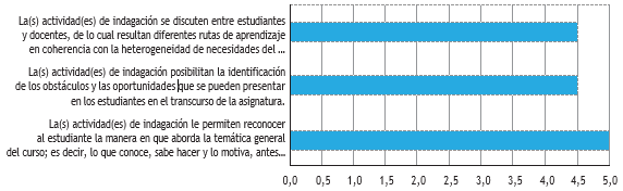 Luego de las generalidades, el primer momento de los cursos es el de indagación, valorado por el estudiantado con 4,6/50, como se refleja en la Figura 15. En este espacio se han identificado problemas y obstáculos encontrados por el estudiantado en sus propios desempeños o en las empresas, bien sea al momento de contactarlas o durante el transcurso de la práctica, generando así un cúmulo de conocimientos útil para el docente en su labor de reorientar de forma dinámica la indagación y de marcar una efectiva ruta de apropiación del conocimiento, de las técnicas y de las estrategias a utilizar. El estudiantado considera necesaria la ampliación de estos espacios, a través discusiones, pues han sido muy provechosos para reconocer la situación inicial del sector donde se realizará la práctica. Adicionalmente, otras personas estudiantes aseguran no haber recibido estrategias diferenciales de enseñanza, de acuerdo con lo establecido en el contrato didáctico. Con todo, las prácticas pueden mejorar, fortaleciendo el componente investigativo diagnóstico territorial y definiendo estrategias didácticas que den cuenta de los diferentes procesos y ritmos de aprendizaje del estudiantado.