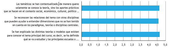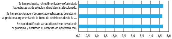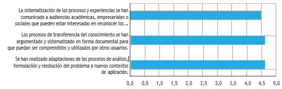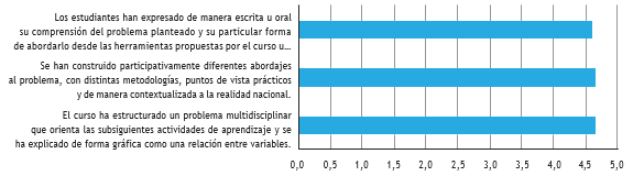 El tercer momento de las asignaturas ha sido calificado con 4,6/5,0, como se analiza en la figura 17, y corresponde a la problematización. En este momento se estructura una situación organizacional no resuelta, abordada de manera interdisciplinaria. Permanentemente el estudiantado comparte su experiencia frente a la práctica; esto facilita el análisis de cada caso como un ejemplo real, evaludado por los demás alumnos. Ellos también lo comparan con la situación problémica identificada en su empresa, favoreciendo la visión de las múltiples aristas del abordaje y resolución de situaciones desconocidas. El estudiantado indica sentirse satisfecho, pues identificar las variables que explican los problemas, así como el contexto actual local e internacional, les ha permitido entender adecuadamente las situaciones organizacionales y empresariales por resolver de manera técnica. La forma de presentar el problema desde distintas metodologías empresariales o sociales constituye una fortaleza de la asignatura.