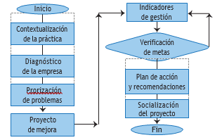 Una vez definida la organización real donde se llevará a cabo la práctica empresarial, esta se describe desde un punto de vista sistémico para aplicar una lista de verificación a manera de indagación, con miras a elaborar un informe diagnóstico de la situación actual. Del análisis del direccionamiento estratégico de la empresa, o de su construcción en caso de no existir, se analizan los hallazgos para identificar y priorizar la problematización según los denominados principios de auditoría (ISO 19011:2018): integridad, imparcialidad, cuidado profesional, confidencialidad, independencia, un enfoque basado en evidencias para formular un proyecto de mejora en concordancia con lo encontrado frente a lo esperado, la aceptación por los interlocutores de la empresa, las exigencias del entorno y las implicaciones éticas. El proyecto de mejora se implementa y al mismo tiempo se revisan los indicadores de gestión de la empresa (o construyen en caso de no tenerlos) para constatar las metas planteadas, con el propósito de aplicar una mejora continua a los procesos de la empresa y a la toma de decisiones.