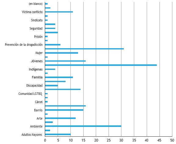 En relación con la población beneficiada, el acompañamiento del estudiantado a los proyectos de las organizaciones comunitarias fue particularmente útil para gestionar obras de infraestructura, la mejorara de condiciones medioambientales, proyectos artísticos, deportivos, o los dirigidos a niños, jóvenes, mujeres, familia, adultos mayores, personas en situación de discapacidad y víctimas del conflicto. Finalmente, los planes de acción en los cuales participó el estudiantado estuvieron fundamentalmente relacionados con la planeación organizacional, la logística para la realización de eventos, la gestión de recursos, alianzas y capacitaciones, además de la realización de estudios, reuniones con actores estratégicos y la publicidad.