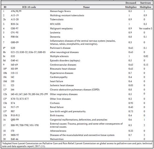 For the final calculation of palliative care needs for each group of diseases, the Lancet group, based on expert criteria, developed a multiplier for each disease to establish the proportion of deceased persons who were suffering and who would eventually require palliative care. This information is summarized in Table 2.