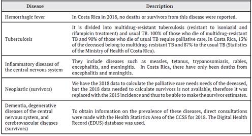 In the case of the palliative care needs of the group of the deceased, the researchers of this work used the data available from the National Institute of Statistics and Census (INEC), on general deaths in Costa Rica, for the period 2018, as this was the latest period recorded at the time of the study. INEC classifies the causes of deaths using the ICD 10 Codes and allows their analysis by the province of residence. For some particular diseases, the information required for the calculation of need was obtained from data from the Ministry of Health, the Expediente Digital en Salud (EDUS), and the CCSS statistics office, as summarized in Table 2.