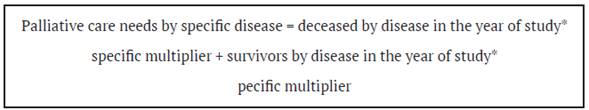 Palliative care needs for each specific disease are calculated from the sum of the product of the deceased for each specific disease in the study year by the disease-specific multiplier and the patient survivors for each disease with its respective multiplier in the study year; as shown in the formula below:
