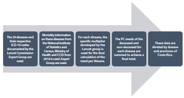 The total need for palliative care would be the sum of the palliative care needs for each specific disease. For the present study, the aforementioned methodology was used and which is detailed in another publication. 11 The methodology used in this study is summarized in Figure 1: