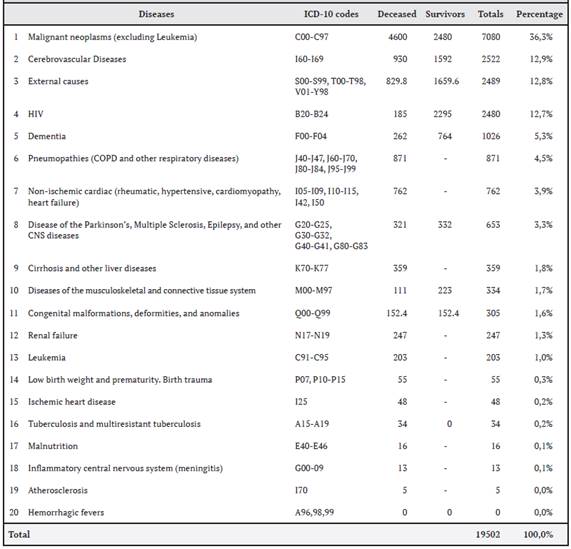 Estimates were worked on two different groups of this population, the deceased (patients who died in the year of study due to one of the 20 diseases) and the survivors (patients who suffered from the disease in the year studied).