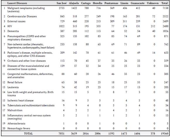 When analyzing the 5 diagnoses that justify palliative care needs in the country (see Table 3), 4 diagnoses consistently appear among the causes of palliative care needs in all the provinces of the country. Neoplastic diseases are the first diagnosis that justifies these needs in all of them. The other 3 diseases are HIV-AIDS, cerebrovascular disease, and external causes. Dementias are in fifth place in the provinces of the central valley, pneumopathies in the provinces of Puntarenas and Limón, and heart disease in Guanacaste.