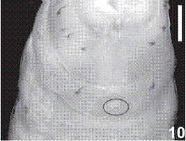 Fig. 10: Nine ventrite abdominal larvae, ventral view, showing the terminal Ampulla with the circles. (10) Passalus (Pertinax) convexus Dalman, 1817. Scale bars = 1.0 mm.