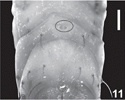 Fig. 11: Nine ventrite abdominal larvae, ventral view, showing the terminal Ampulla with the circles. (11) Passalus (Passalus) interruptus (Linnaeus, 1752). Scale bars = 1.0 mm.