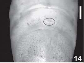 Fig. 14: Nine ventrite abdominal larvae, ventral view, showing the terminal Ampulla with the circles. (14) Odontotaenius zodiacus (Truqui, 1857). Scale bars = 1.0 mm.