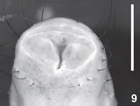 Description: Larva of third instar (n = 5). Length = 8.09-15.99 mm; head width = 1.89&2.66 mm; prothorax width = 2.98-3.83 mm. Head, with short and sparse pubescence (Fig. 2 and Fig. 3); two or three post-antennal setae (2-3 HPA), elongate, reaching antennal tip when extended and folded forward. Epicranial suture present with distinct frontal stem in V shaped. Coronal suture almost half of head capsule length. Clypeus distinctly transverse and pubescent. Labrum transverse, with anterior margin rounded and with moderately elongate and sparse setae. Epipharynx (Fig. 4) with corypha rounded and with setose, clithrum small and pigmented, acanthoparia with elon&gate setae, acroparia smooth, chaetoparia with long and sparse setae, pedium marked by the presence of many setae in the central area, laeotorma and dexiotorma strongly pigmented. Mouthparts protracted (Fig. 5, Fig. 6 and Fig. 7): mandibles (Fig. 5) symmetrical, movable, triangular, tridentate at apex, external margin distinctly angulate, with many sparse setae (except in apical part), mesal surface curved and smooth, inner cutting edge with a blunt tooth, mola developed, baso-lateral area, near the mola, with a declivity and with one tuft of short and dense setae near the condilun, and brustia developed with a dense, compact tuft of elongate setae. Maxillae (Fig. 6) mobiles and elongate, with galea elongate, almost as long as apical segment of maxillary palp, falcate at apex, with elongate setae at inner edge; lacinia entire, reaching the apical third of galea, with single apex, inner margin with fringe of elongate setae; palpifer present with six basal setae; maxillary palp with two segments, the apical segment slightly longer than basal segment and narrowing near the apex, basal segment with four setae. Labium with prementum, mentum and submentum; ligula (Fig. 7) rounded at apex and dense and short setae; prementum with a single fringe of setae near base; mentum short, smooth, and posterior margin converging back in V-shaped; submentum with one pair of elongate setae at the sides the suture between men-tum and submentum; submentum fused at the gula; gula laterally with many setae, medially glabrous. Thorax. Segments glabrous, with prothoracic spiracles larger than and directed opposite to mesothoracic, metathoracic and abdominal spiracles. Pronotum entirely pubescent and with two lateral sclerotized areas, each with 3-5 long lateral setae (3-5 PSL); median area between sclerotized pronotal areas distinct glabrous. Mesonotum no dorsal mesonotal setae (MSD) and one pair of lateral mesono-tal setae (0MSD; 2 MSL). Metanotum with one pair dorsal metanotal setae and two lateral metanotal setae (1 MTD; 2 MTL). Pro and mesothoracic legs well developed (with coxa, trochanter, femur, tibia and tarsungulus) and pubescent. Metathoracic legs reduced (Fig. 8) with only one segment bearing six small, lateral teeth basal to the apex. Abdomen. Ten segments visible when viewed dorsally or laterally. Abdominal segments each with one pair of medial tergal setae and one pair of lateral tergal setae (1 TM; 1 TL). Anal opening (Fig. 9) V-shaped; anal ring with 16-20 setae (18-20 AR); IX abdominal ventrite with one pair of setae in medial area (AV9).