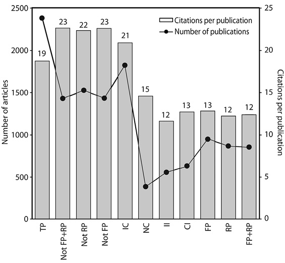 Figure 4 Productivity and citation according to nationality in local and internationally produced articles. TP: total articles. Not FP+RP: both first and corresponding authors are not from Guatemala. Not RP: corresponding author is not from Guatemala. Not FP: first author is not from Guatemala. IC: internationally collaborative papers. NC: nationally collaborative papers. II: institutional independent papers. SI: Guatemala independent papers. FP: first author is from Guatemala. RP: corresponding author is from Guatemala. FP+RP: both first and corresponding authors are from Guatemala.