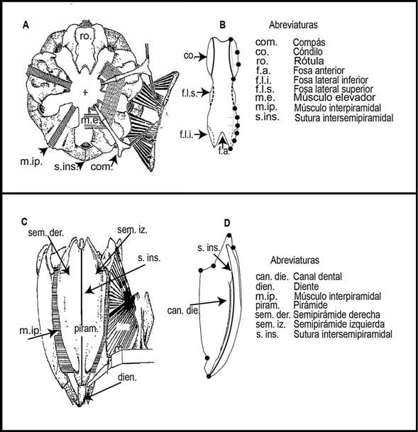Fig. 1. Fig. 1 (A) Linterna de Aristóteles vista en el plano superior, (B) Rótula parte aboral y sus landmarks y semilandmarks, (C) Linterna de Aristóteles vista desde el plano vertical, (D) Semipirámide vista lateral interno y sus landmarks. Imagen modificada de Märkel (1979). (A) Aristotle's lantern view from above, (B) Rotula view from above and its landmarks and semilandmarks, (C) Aristotle's lantern view from the side, (D) Left demipyramid inner side and its landmarks. From Märkel (1979).