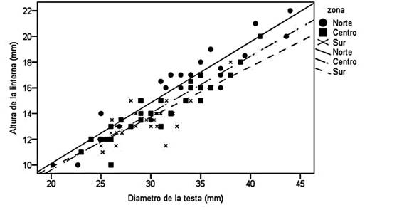Morfometría clásica: El diámetro de la testa de E. tribuloides osciló entre 20 y 45 mm, con un promedio de 30.44 mm y una desviación estándar de 4.89 mm, mientras que la altura de la linterna de Aristóteles osciló entre 9 y 18 mm con un promedio de 14.5 mm y una desviación estándar de 2.42 mm. La relación entre esas dos estructuras fue lineal en todos los sitios. Los individuos del norte presentaron las linternas más grandes, mientras que los del sur las más pequeñas (Fig. 2). La prueba de Levene no mostró diferencias significativas entre grupos (F = 2.18, P = 0.119) y la interacción entre las zonas y la altura de la linterna indicó que las pendientes fueron homogéneas (F=0.964, P = 0.386). Por su parte, el ANCOVA manifestó diferencias significativas entre grupos (F= 10.74, P < 0.001) con un coeficiente de regresión de 86 %, mientras que la comparación por pares con ajuste de Bonferroni señaló que el norte es diferente al centro (SE = 0.249, P = 0.002) y el sur (SE = 0.253, P < 0.001). Sin embargo, no hubo diferencias entre centro y sur (SE = 0.226, P = 0.771).