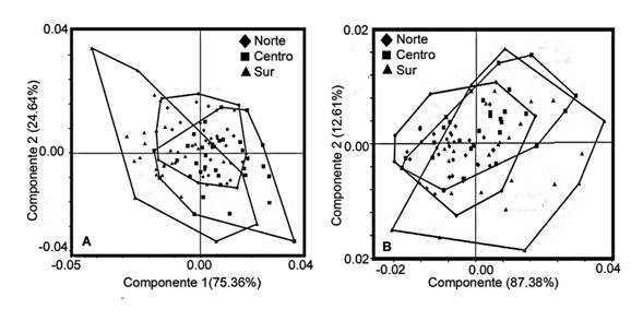 Por otro lado, el Análisis de Componentes Principales Entre Grupos para la rótula mostró la distribución de los individuos en dos ejes, el primero contiene 75.36 % de la variación de la forma. La proyección de los individuos sobre los dos ejes canónicos reveló solapamiento entre los sistemas arrecifales. Pese a ello, se observa que los individuos del norte presentan mayor variación morfológica en comparación con los individuos del sur (Fig. 3A). Para el caso de la semipirámide, la distribución de los individuos fue sobre dos ejes canónicos de los cuales el primer eje contuvo el 87.38 % de la variación. La proyección de los individuos sobre los dos ejes canónicos presenta gran solapamiento entre los grupos del norte, centro y sur. Sin embargo, se observa que los individuos del norte presentaron mayor variación que los individuos del sur (Fig. 3B).