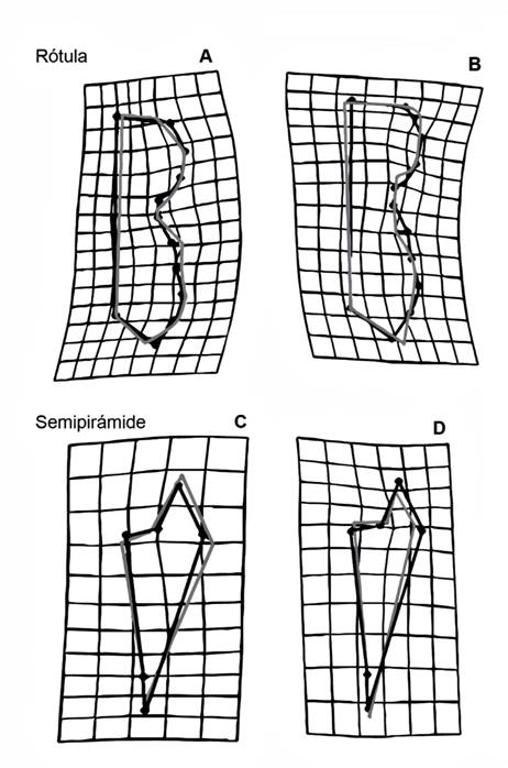 Las rejillas de deformación revelaron algunas diferencias en la forma de la rótula, principalmente en el cóndilo, que es más robusto en los individuos del centro. También, la fosa lateral superior de los individuos del norte es angosta (Fig. 4). Para el caso de la semipirámide, se revelaron algunas diferencias morfológicas donde los individuos que se distribuyeron sobre los valores negativos de la primera función discriminante de la figura 3B son más robustas. Por el contrario, los individuos que se distribuyeron sobre los valores positivos de la primera función discriminante de la figura 3B poseen semipirámides más estrechas. Por otro lado, existe una notoria variación de la forma en la parte superior de la semipirámide (Fig. 4).