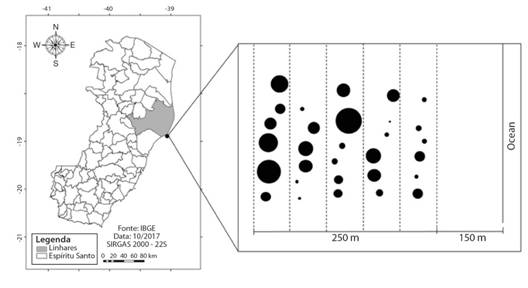 Study area: The study site is in the municipality of Linhares, Espírito Santo, (19°39’26.125” S, 39°51’19.739” W), Brazil (Fig. 1). In this region, there are restinga strips of more than 30 km wide interspersed by extensive open areas (Colodete & Pereira, 2007). The climate is Aw type according to Köeppen: tropical hot, with moist summers (Oct-Jan; 166 mm on average) and dry winters (water deficit from Feb-Sep), reaching 1 200 mm per year. The average temperature is 20.7 to 26.2 °C, with the coldest temperatures (20.7 oC) in June and the warmest (26.2 oC) in January.