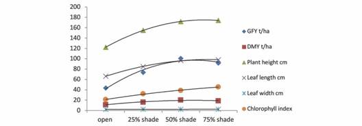 The microclimate created by the shade has a direct impact on the wind speed, temperature regime, humidity, evapo-transpiration and soil moisture levels. Hence, these conditions are likely to impact the biomass production of any crop growing under shade. If the light intensity is not reduced below the threshold level, other factors will increase biomass production. In the present study, green and dry biomass of many genotypes increased under shading. It appears that the less light intensity under shade was compensated with higher moisture availability compared to open conditions. Araujo, Santos, Rodriguez, and Pezzopane (2018) have also identified the water availability index and the day length as key seasonal factor for dry matter production in guinea grass. Increase in yield under moderate light reduction has also been reported by Samarakoon, Wilson and Shelton (1990). Genotypic variation in guinea grass, involving a few genotypes, for shade tolerance was observed in earlier reports also (Kaushal et al., 2000).