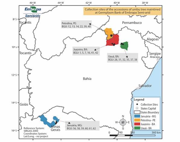 Agronomic and genetic characterization are important tools for genetic improvement and possible agronomic exploitation. However, there are few studies that focus on the genetic variability of umbu tree. Santos, Rodrigues, and Zucchi (2008) studied the genetic variability of umbu tree in the Brazilian semi-arid region using AFLP markers and found high variability in populations, suggesting that the genetic diversity of umbu tree could be used to improve the species. The Embrapa Semiárido in Brazil maintains an umbu tree germplasm collection, with 80 accessions (Ramos, Queiroz, Romão, & Silva Júnior, 2008).