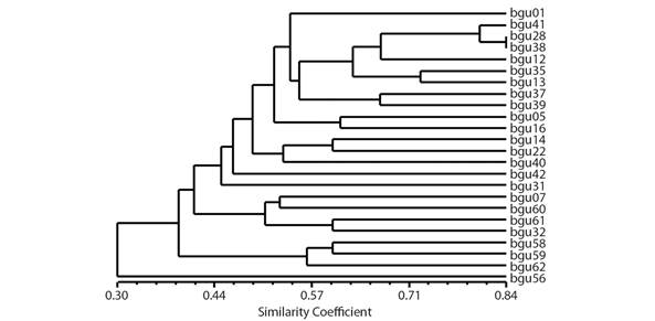 El dendrograma UPGMA generado con una matriz de similitud de coeficientes de Jaccard, formó cuatro grupos con punto de corte en 0.44. El coeficiente de similitud osciló entre 0.30 y 0.84, indicando una gran divergencia entre las accesiones. El análisis Bayesiano realizado en el software Structure sugiere la existencia de dos subpoblaciones, una formada por las accesiones de la región de Januária y otra derivada de las regiones de Juazeiro, Uauá y Petrolina. El valor de ΦST de 0.12 derivado del análisis molecular de la varianza indica moderada variación genética entre las cuatro poblaciones, sugiriendo que la variabilidad genética se estructura moderadamente en función de la región.