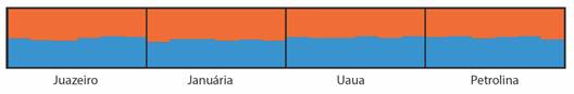 The Bayesian analysis indicated the existence of only two groups, the three accessions from Januária, Minas Gerais in one group and the remaining accessions from Uauá, Bahia; Juazeiro, Bahia; and Petrolina, Pernambuco in another group (Fig. 4).