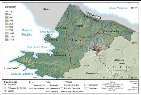 El municipio La Cruz en Costa Rica está ubicado en la vertiente del Pacífico, al noroeste del país en la frontera entre Costa Rica y Nicaragua. Este municipio y sus principales comunidades se muestran en la Fig. 1. La Cruz limita al norte con el departamento Rivas, Nicaragua; al sur con el cantón Liberia; al oeste con el Océano Pacífico; y al este con el cantón Upala de la provincia Alajuela, los últimos tres pertenecientes a Costa Rica. A pesar de representar una limitada porción del corredor fronterizo (1 389.87 km2, equivalentes a un 7.86 % del área total del corredor fronterizo), se considera a La Cruz como un territorio altamente representativo de las dinámicas socioambientales, ya que posee zonas costeras y de altura con condiciones similares a las encontradas en el resto de dicho territorio fronterizo (Bautista-Solís et al., datos sin publicar). La amplitud máxima en La Cruz es de 81 km, en dirección noreste a suroeste, lo cual facilita el traslado desde la zona costera a la zona más oriental donde predominan comunidades agropecuarias y forestales (Bautista-Solís et al., datos sin publicar). El territorio La Cruz comprende desde unos 150 m al noroeste del Hito 14, frontera con la República de Nicaragua, donde la línea imaginaria intercepta el río Las Haciendas hasta punta Santa Elena, en la península del mismo nombre. Las elevaciones son fluctuantes, pero no sobrepasan los 350 metros sobre el nivel medio del mar (m s.n.m.), a excepción del volcán Orosí que alcanza los 1400 m s.n.m. Algunos centros urbanos de los distritos del cantón son: Ciudad La Cruz 255 m s.n.m., Santa Cecilia 337 m s.n.m., La Garita 300 m s.n.m. y Cuajiniquil 10 m s.n.m. (Bautista-Solís et al., datos sin publicar).