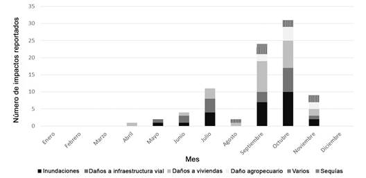 Impactos de eventos hidrometeorológicos en La Cruz, Guanacaste, Costa Rica: En este apartado, se caracterizan los impactos hidrometeorológicos registrados en La Cruz. La Fig. 2 presenta la distribución de los impactos durante el año, donde se aprecia que la mayor cantidad de impactos se producen durante la época lluviosa. Las inundaciones y las sequías son los impactos más recurrentes en el periodo analizado de 45 años (1973-2018). Estos eventos han generado afectaciones principalmente por daños a viviendas e infraestructura vial. La Fig. 2 muestra una distribución bimodal con dos máximos, uno en julio y otro en septiembre y octubre mayor que el primero, mientras que en agosto se muestra un descenso de los impactos reportados. Esto está de acuerdo con la distribución de las precipitaciones observadas en el municipio (Rodríguez, Alfaro, & Cortés, 2021).