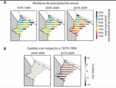 Fig. 3 (a) Promedios anuales (mm/año) de precipitación bajo un escenario pesimista de concentraciones en diferentes períodos calculados como la mediana de los ensambles de los modelos CMIP5 para el cantón de La Cruz, Guanacaste. (b) Cambios relativos al período histórico 1979-1999 (b). El Océano Pacífico está sombreado en gris. / Fig. 3. (a) Precipitation annual means (mm/year) for different periods under a pessimistic scenario computed as the ensemble median for CMIP5 models shown in Table 1 at La Cruz municipality, Guanacaste. (b) Changes relative to the historical period 1979-1999. The Pacific Ocean is shaded in grey.