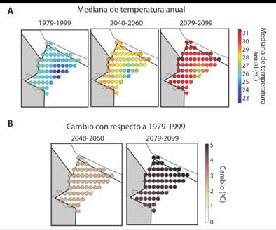 Fig. 4 (a) Promedios anuales (oC) de temperatura bajo un escenario pesimista de concentraciones en diferentes períodos calculados como la mediana de los ensambles de los modelos mostrados CMIP5 para el cantón La Cruz, Guanacaste. (b) Cambios relativos al período histórico 1979-1999. El Océano Pacífico está sombreado con gris. / Fig. 4. (a) Temperature annual means (oC) for different periods under a pessimistic scenario computed as the ensemble median for CMIP5 models shown in Table 1 at La Cruz municipality, Guanacaste. (b) Changes relative to the historical period 1979-1999. The Pacific Ocean is shaded in grey.