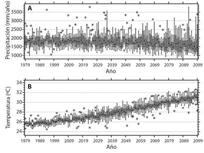 Fig. 5 Valores anuales proyectados bajo un escenario pesimista de concentraciones en la (a) precipitación y (b) temperatura de 1979 a 2099 promediado para todo el cantón de La Cruz. Las cajas en el diagrama muestran la variabilidad de todos los modelos CMIP5, N = 14 modelos y simulaciones climáticas de la Tabla 1. / Fig. 5. Annual values of (a) precipitation and (b) temperature under a pessimistic scenario from 1979 to 2099 averaged for all the La Cruz municipality. The boxes of the diagram show the variability of all CMIP5 models in Table 1 (N = 14).