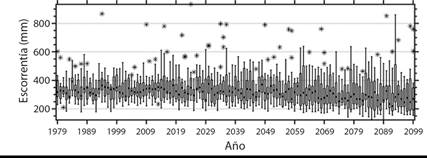 La combinación de ambos efectos produce una respuesta amplificada en las proyecciones de escorrentía de 1979 a 2099 en la segunda mitad del siglo XXI, y se notan reducciones importantes en este parámetro a partir de alrededor 2040. Precisamente, esta tendencia es una combinación de las reducciones en precipitación y aumentos en temperatura en ese periodo. Esto por cuanto la disminución en la precipitación y el aumento en la evapotranspiración, debido al aumento en la temperatura, traerá consigo suelos más secos y menos agua disponible para producir escorrentía superficial, afectando también la infiltración y recarga de los sistemas acuíferos. Las tendencias positivas de temperatura pueden aumentar la aridez y disminuir la escorrentía a través de la intensificación del ciclo hidrológico regional (Vargas-Sanabria & Quesada-Román, 2018).