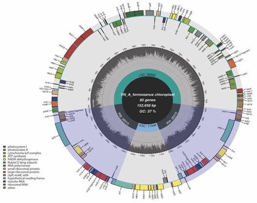 Sample collection, DNA extraction, library construction, and sequencing: Samples of A. formosanus were provided by the Biotechnology Center of Ho Chi Minh City (HCMBIOTECH), the voucher sample is kept at this center for conservation. Total DNA was extracted from fresh leaves using the Isolate II Plant DNA Kit (Bioline, UK). DNA quality and quantity were determined by 1 % gel electrophoresis and Nanodrop, respectively (ThermoScientific, Delaware, USA).