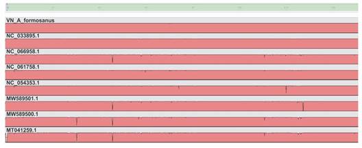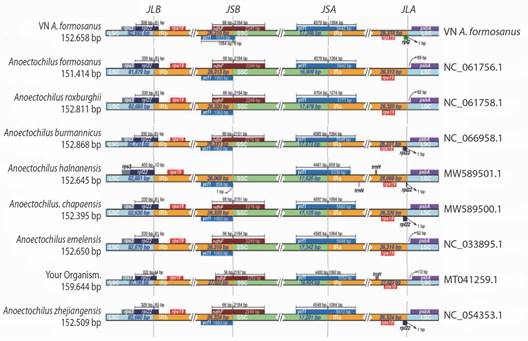 Sequence annotation and comparison of cp genomes: A total of 142 genes were annotated in the obtained cp genome, including 92 protein-coding genes, 10 rRNA genes, and 39 tRNA genes. To compare the gene composition of the cp genome, we examined eight other Anoectochilus species, whose data had been previously published on NCBI and are presented in Table 1. The cp genome of A. formosanus exhibited slight differences compared to the other cp genomes, particularly in the number of coding genes and tRNA genes. Surprisingly, several variations were observed between the A. formosanus specimen from Vietnam and the one from China (NC_061765.1).