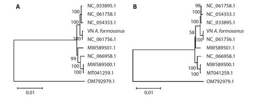 Phylogenetic relationship: The phylogenetic analysis of the nine Anoectochilus cp genomes revealed a distinct clustering pattern among jewel orchid species. The cp genomes are divided into two main clades with high bootstrap values (Fig. 5). In both phylogenetic trees built by Neighbor- Joining phylogeny (Fig. 5A) and Maximum Likelihood method (Fig. 5B), A. formosanus accession from Vietnam and A. formosanus accession from China (NC_061756.1) are formed a sub clade which are sisters with another clade forming by three accessions namely A. emeiensis (NC_033895.1), A. roxburghii (NC_061758.1) and A. zhejiangensis (NC_054353.1). Nevertheless, the is slight difference between two phylogenies where A. hainanensis (MW589501.1) is grouped with other three accessions, namely A. burmannicus (NC_066958.1), A. chapaensis (MW589500.1) and A. calcareus (MT041259.1) with the high bootstrap value at 99 to form the second main clade using NJ method (Fig. 5A). Whereas, by using ML method A. hainanensis (MW589501.1) is clustered in different clade which are closer to two A. formosanus accessions (Fig. 5B).