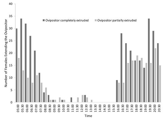 Calling behavior: The emergence of adults occurred after 15:00 h. Adults were not highly active for about 20 min after emergence, which allowed them to be sexed more easily. Females of P. longifila performed sexual calling through complete (dark bar) or partial extrusion (pale bar) of the ovipositor mainly in the early morning (5:00-7:30 h), in the afternoon (16:30-18:00 h) and in the evening (18:30-20:30 h) (Fig. 1). There was a higher frequency of complete ovipositor extrusion (387 times) versus partial ovipositor extrusion (242 times) (Fig. 1). Females showed the ovipositor at least once up to 35 hours after emergence, however, after this time and up to 96 hours of follow-up (day 4) no ovipositor extrusion was evident. It was found that 95 % of the females evaluated showed complete or partial ovipositor for the first time during the first 4 hours after emergence. Ovipositor extrusion occurred mainly during scotophase.