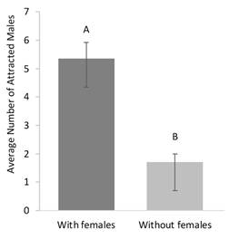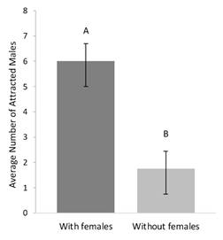 Fig. 3 Average number of P. longifila males attracted to confined females under laboratory conditions (ratio of attraction of 10 females to 10 males, n= 20), different letters indicate significant differences (Tukey test, p < 0.05).