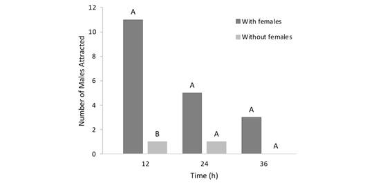 Fig. 4 Number of P. longifila males attracted to field-confined females and the control 12, 24 and 36 hours after installation (n = 15). Different letters show differences between treatment and control (for 12 h, Games-Howell post Welch’s test p < 0.05; for 24 h and 36 h, Tukey post one-way ANOVA p > 0.05).