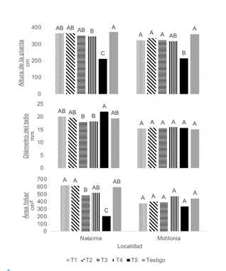 En la evaluación fueron evidentes las diferencias estadísticas significativas para las localidades y los tratamientos en los parámetros de crecimiento de las plantas (Tabla 1). En los 2 ambientes el tratamiento T5 de trinexapac-etil fue el que presentó la menor altura a cosecha con un valor aproximado de 2,1 metros comparada con la longitud del testigo que superó los 3,5 metros (Figura 1). Los resultados demuestran que la aplicación de 200 g i.a.ha-1 de trinexapac-etil en los estados de desarrollo 1 y 3 reduce entre el 40,8 y 43,5% el porte de la planta en MOT y NAT respectivamente. Este resultado coincide con lo reportado por Julio et al. (2021) quienes encontraron que con el uso trinexapac-etil se logró una reducción del 40% de la altura de las plantas de sorgo.