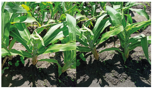 Figura 2 Evidencia de plantas de sorgo dulce con síntomas de fitotoxicidad por efecto de la aplicación de Trinexapac-etil a dosis de 200 g i.a. ha-1 en la localidad del Valle cálido del Alto Magdalena (NAT) durante la evaluación del ciclo productivo 2022.