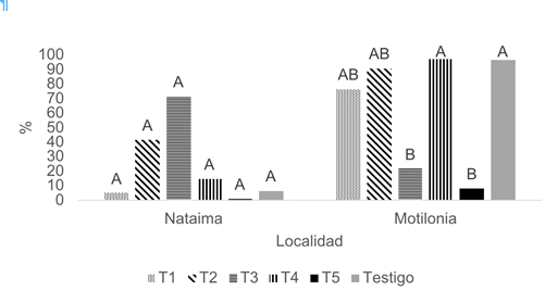 En las 2 localidades se evidenció el volcamiento basal de las plantas con diferencias estadísticas para las 3 fuentes de variación (Tabla 2), de forma particular en el análisis del ambiente de NAT los datos no presentaron una distribución normal por lo que, aunque son evidentes las diferencias entre los retardantes de crecimiento según la comparación de medias los tratamientos son estadísticamente semejantes. Cabe señalar que el tratamiento T5 de trinexapac-etil obtuvo los menores porcentajes de volcamiento en NAT y MOT con 1 y 8,3% respectivamente, el cual fue contrastante con el tratamiento T2 de etefón a mínima dosis que tuvo porcentajes de volcamiento de 91% para MOT y 41,7% para NAT. Los demás tratamientos T1, T3, T4 y el testigo fueron contrastantes en las 2 localidades, es decir que existe un efecto ambiental que influye en el comportamiento de los retardantes respecto a esta variable (Figura 3). De acuerdo con Stubbs et al. (2020) se puede inferir que la resistencia de flexión del tallo fue menor en MOT que en NAT. La fuerza de referencia o de carga externa aplicada sobre las plantas fue inducida principalmente por condiciones ambientales adversas, como la velocidad del viento y las altas precipitaciones en momentos de flexión. Esta condición de exceso de lluvia fue predominante en MOT, donde tuvo picos de precipitación de hasta 90 mm día en estadios tempranos de formación de grano y que se lograron determinar en el balance hídrico que se elaboró para las localidades de prueba (Flórez- Gómez 2023).