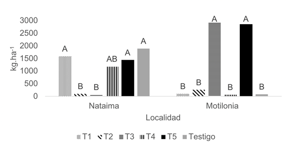 Figura 4 Comparación de medias para la variable del rendimiento de semilla en el periodo productivo 2022 en localidad del Valle cálido del Alto Magdalena (NAT) y el Caribe seco colombiano (MOT).
