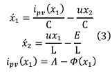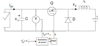 La gran mayoría de los sistemas fotovoltaicos utiliza convertidores de potencia conmutados. Estos convertidores consisten de capacitores, inductores, diodos y transistores (usualmente MOSFET). Estos últimos operan de forma conmutada con el fin de obtener menores pérdidas en el proceso de conversión. Un convertidor de potencia se puede modelar matemáticamente por medio de un conjunto de ecuaciones diferenciales que describen el proceso de carga y descarga de los elementos que almacenan energía dentro del circuito, esto es, el inductor y el capacitor. Por ejemplo, las ecuaciones que describen el comportamiento dinámico del convertidor reductor que se muestra en la Figura 4 son las siguientes: