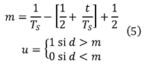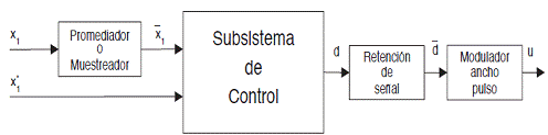 El subsistema de control debe asegurar que de [0,1]. De esta forma, el modulador de anchura de pulsos, comparando d con una señal moduladora triangular o diente de sierra con una amplitud de 1, puede generar u. La expresión matemática que describe la operación del modulador de anchura de pulsos es la siguiente: