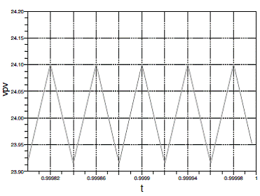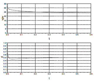 El resultado de la simulación en Scicoslab + Scicos con los parámetros de simulación de el Cuadro 3 se muestra en las figuras 10 y 11. Nótese que para el modelo promediado se obtuvo la misma respuesta dinámica en Python y en Scicoslab (Figura 6 - Python y Figura 10 - Scicoslab). Así mismo, en la Figura 11 se muestra un comportamiento promedio similar al de las figuras 6 y 10, pero en este caso es posible ver el rizado en la tensión del dispositivo fotovoltaico debido a la conmutación del interruptor (ver Figura 12).