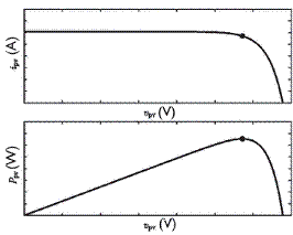 Figura 2: Curvas de voltaje vs. corriente y voltaje vs. potencia de un dispositivo fotovoltaico típico a temperatura e insolación constantes. El círculo rojo indica el punto de máxima generación de potencia.