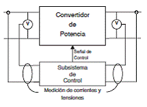 Dichos objetivos se obtienen por medio de dos elementos: el convertidor de potencia y el subsistema de control. El convertidor de potencia se entiende en este documento como el circuito electrónico conformado por componentes pasivos (inductores y capacitores) y activos (transistores, diodos, etc.), que permiten convertir niveles de tensión y de corriente. Algunos de los dispositivos activos del convertidor de potencia son controlados por medio del subsistema de control, el cual, con las mediciones de las variables eléctricas del convertidor de potencia, los valores de referencia y un algoritmo de control, genera las señales de control. La Figura 3 muestra el diagrama de bloques de una unidad de potencia.