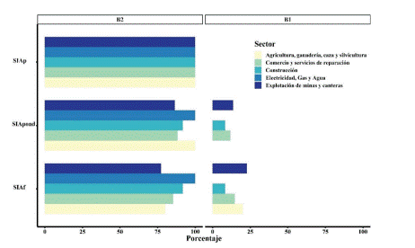 Figura 1 Porcentaje de proyectos por sector productivo con calificaciones de B2 y B1 de acuerdo con los diferentes valores de significancia ambiental (SIA preliminar, SIA ponderado y SIA final).