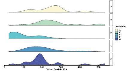 Figura 2 Distribución de los valores finales de SIA de acuerdo con el sector o actividad productiva: (A) Agricultura, ganadería, caza y silvicultura; (C) Comercio y servicios de reparación; (E) Construcción; (F) Electricidad, Gas y Agua; (G) Explotación de minas y canteras.