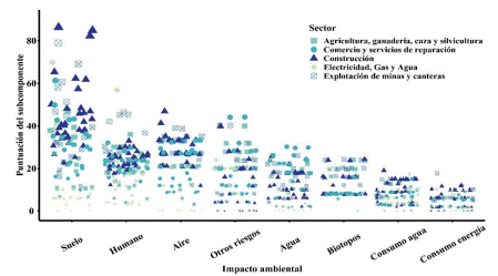 De acuerdo con la figura 3, los diferentes subcomponentes ambientales pertenecientes a los sectores industriales evaluados impactan en menor grado a los medios Agua, Biotopos, y Energía. Es notable que los sectores que influyen en menor medida en el impacto ambiental sobre los componentes ambientales son los sectores industriales Electricidad, gas y agua, así como el de Agricultura, ganadería, caza y silvicultura.