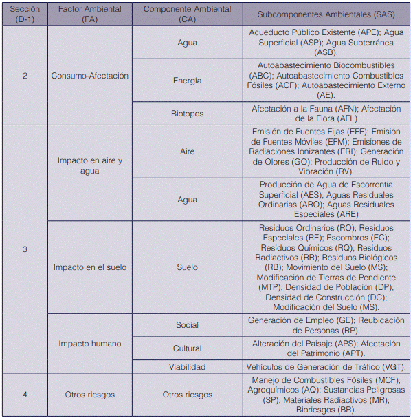 Entre los datos y parámetros que incluye y evalúa el D-1 respecto al proyecto a desarrollar se indican; nombre de la actividad, localización, datos del desarrollador, descripción del proceso productivo (dimensiones, generación de residuos, consumo de agua, electricidad y combustible), marco regulatorio, aspectos e impactos ambientales (cuadro 1) e impacto potencial del proyecto (5). Dichos datos y parámetros se clasifican en diferentes secciones de acuerdo con la metodología de evaluación de impacto ambiental incluida en el Formulario D-1, estas secciones son; Sección 1: Información general del desarrollador del proyecto y de las características principales de la obra, Sección 2, 3 y 4: ver cuadro 1, Sección 5: Criterios de ponderación, Sección 6: Matriz de efectos acumulativos y sinérgicos, Sección 7: Obtención del valor de impacto ambiental del proyecto y, Sección 8: Ficha de descripción del proyecto. El cuadro 1 contiene un resumen de los factores, componentes y subcomponentes ambientales que son evaluados en las secciones 2, 3 y 4, los cuales permiten obtener el valor de impacto ambiental (Sección 6), una vez revisados los criterios de ponderación (Sección 5) (4).