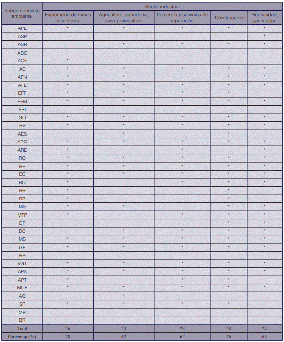 Para cada sector industrial, se evaluaron 37 subcomponentes ambientales (SAS), los cuales se encuentran listados en el cuadro 1, por su parte, en el cuadro 2 se incluye la cantidad de subcomponentes ambientales considerados significativos (*) para cada sector industrial.
